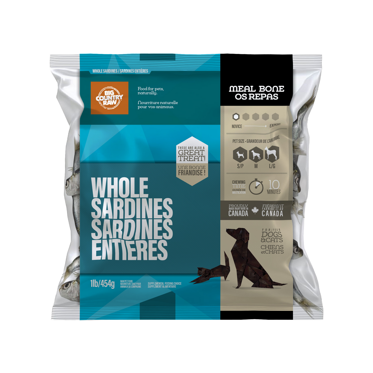 Loved by dogs and cats, sardines offer healthy Omega-3 fatty acids. Individually quick frozen, these tiny fish make a perfect meal topper or treat with the added benefit to joints, coat and brain.