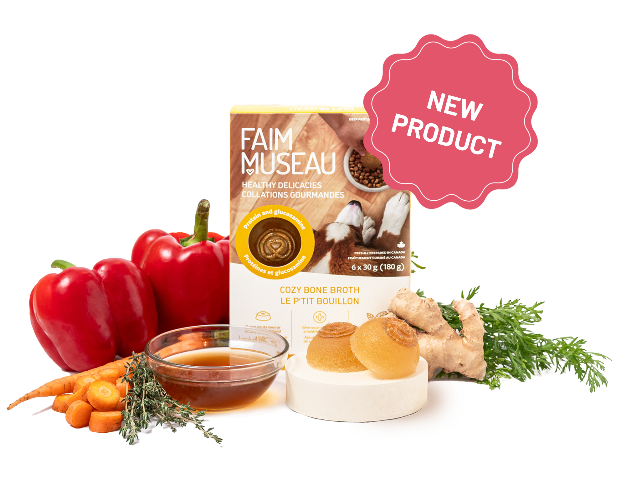Our Cozy Bone Broth has high concentrations of collagen, glucosamine and chondroitin, all of which significantly contribute to your dog’s joint health. This recipe is also a beneficial source of protein, which is essential for muscle fitness.