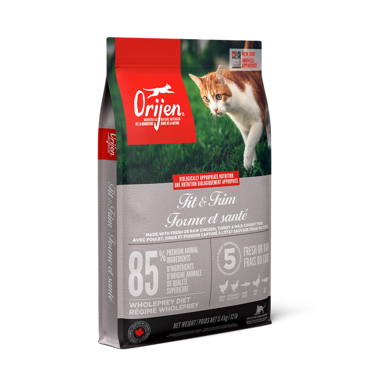 Help your cat thrive with the power of protein-rich recipes that provide peak nourishment. As obligate carnivores, all cats are meant to eat a Biologically Appropriate diet rich in protein from whole animal ingredients. ORIJEN® Fit & Trim diet is optimized to support lean muscle mass and is specifically designed to support peak physical conditioning with quality animal ingredients from fresh or raw1 chicken, turkey and wild-caught fish. With rich inclusions of WholePrey animal ingredients like poultry, fish, organs and bone, ORIJEN Fit & Trim diet is made with the most nutrient-dense, succulent parts of the prey to deliver the lean nutrition cats need. With 85%2 quality animal ingredients and a freeze-dried liver coating, this diet is beyond comparison.