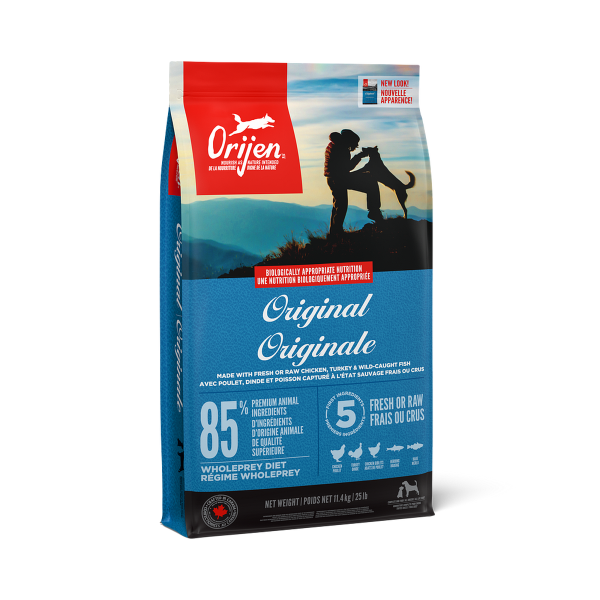 Help your dog thrive with the power of protein-rich recipes that provide peak nourishment. Dogs are ancestral carnivores, so they need a Biologically Appropriate diet rich and varied in whole animal ingredients. ORIJEN® Original diet is packed with 85%1 quality animal ingredients like fresh or raw free-run2 chicken and turkey, and wild-caught or sustainably farmed fish. Packed with WholePrey animal ingredients like organs and bone, ORIJEN food is made with the most nutrient-dense, succulent parts of the prey to deliver the nutrition dogs need. The result is a diet for your canine companion that is beyond comparison.