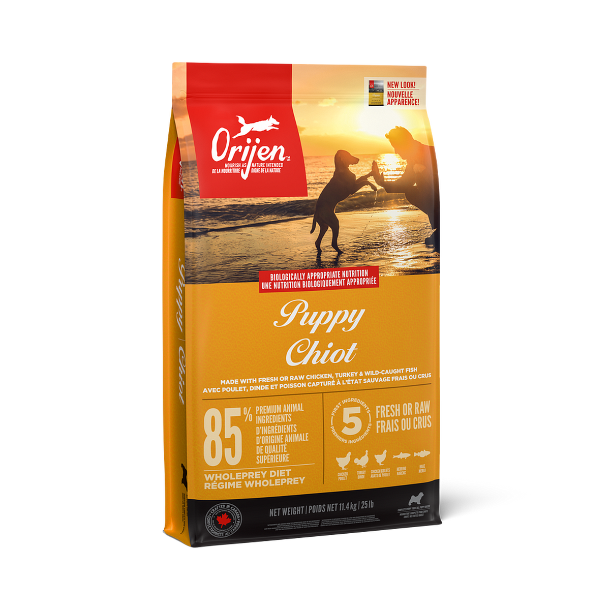 Help your puppy thrive with the power of protein-rich recipes that provide peak nourishment. All puppies do best on a Biologically Appropriate diet rich in protein and fat from quality animal ingredients to support their development. ORIJEN® Puppy diet is packed with 85%1 quality animal ingredients like fresh or raw free-run2 chicken and turkey, and wild-caught or sustainably farmed fish. Packed with WholePrey animal ingredients like organs and bone, ORIJEN food is made with the most nutrient-dense, succulent parts of the prey to deliver the nutrition puppies need. The result is a diet for your canine companion that is beyond comparison.