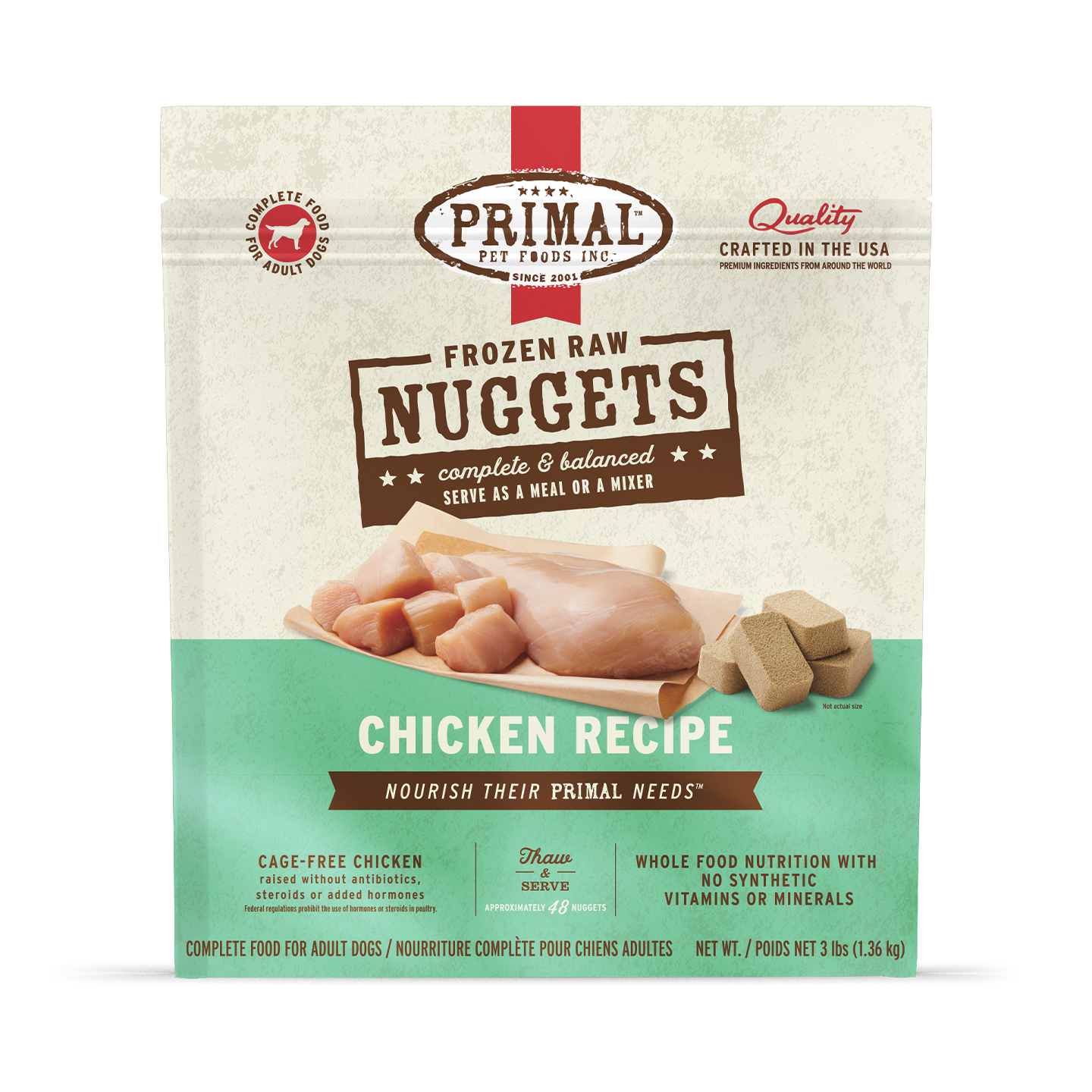 Primal Formulas offer you the convenience and benefits of a well-balanced, safe and wholesome raw-food diet without having to grind, chop, measure or mix the ingredients yourself. Using only the freshest, 100% human-grade ingredients, these 1oz nuggets are antibiotic and steroid free with no added hormones. They contain optimum levels of the amino acids (protein), essential fatty acids, natural-occurring enzymes, and necessary vitamins & minerals that are the building blocks for your pet's healthy biological functions. Your dog will devour this fresh-food diet and you will love how easy it is.