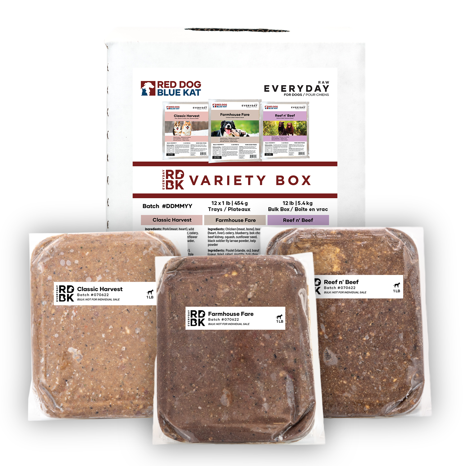 The Everyday Raw 12 lb Variety Bulk Box for dogs includes: