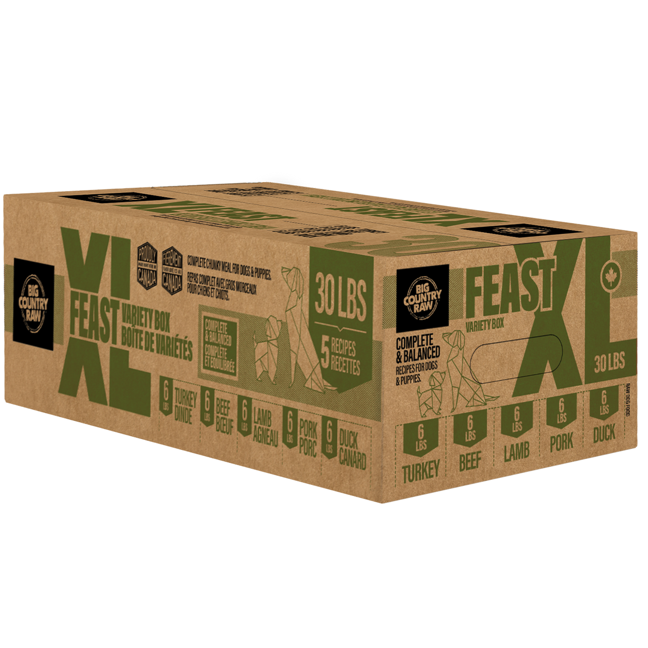The ultimate chicken-less variety box! A total of 5 recipes in our popular XL line - 6lbs each of XL Beef, XL Lamb, XL Turkey, XL Pork, and XL Duck. Perfect for dogs who love protein variety, or are allergic to chicken.