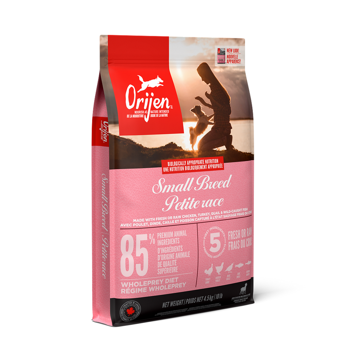 Help your dog thrive with the power of protein-rich recipes that provide peak nourishment. Your small-breed dog has certain nutritional needs and requires a Biologically Appropriate diet in order to thrive. ORIJEN® Small Breed diet is made specifically for smaller dogs, with nourishing protein from free-run1 chicken and turkey, wild-caught fish and quail all packed into a unique kibble shape that is easier for them to eat. Packed with fresh or raw2 WholePrey animal ingredients, ORIJEN food is made with the most nutrient-dense, succulent parts of the prey to deliver the nutrition dogs need. The result is a diet for your small canine companion that is beyond comparison.