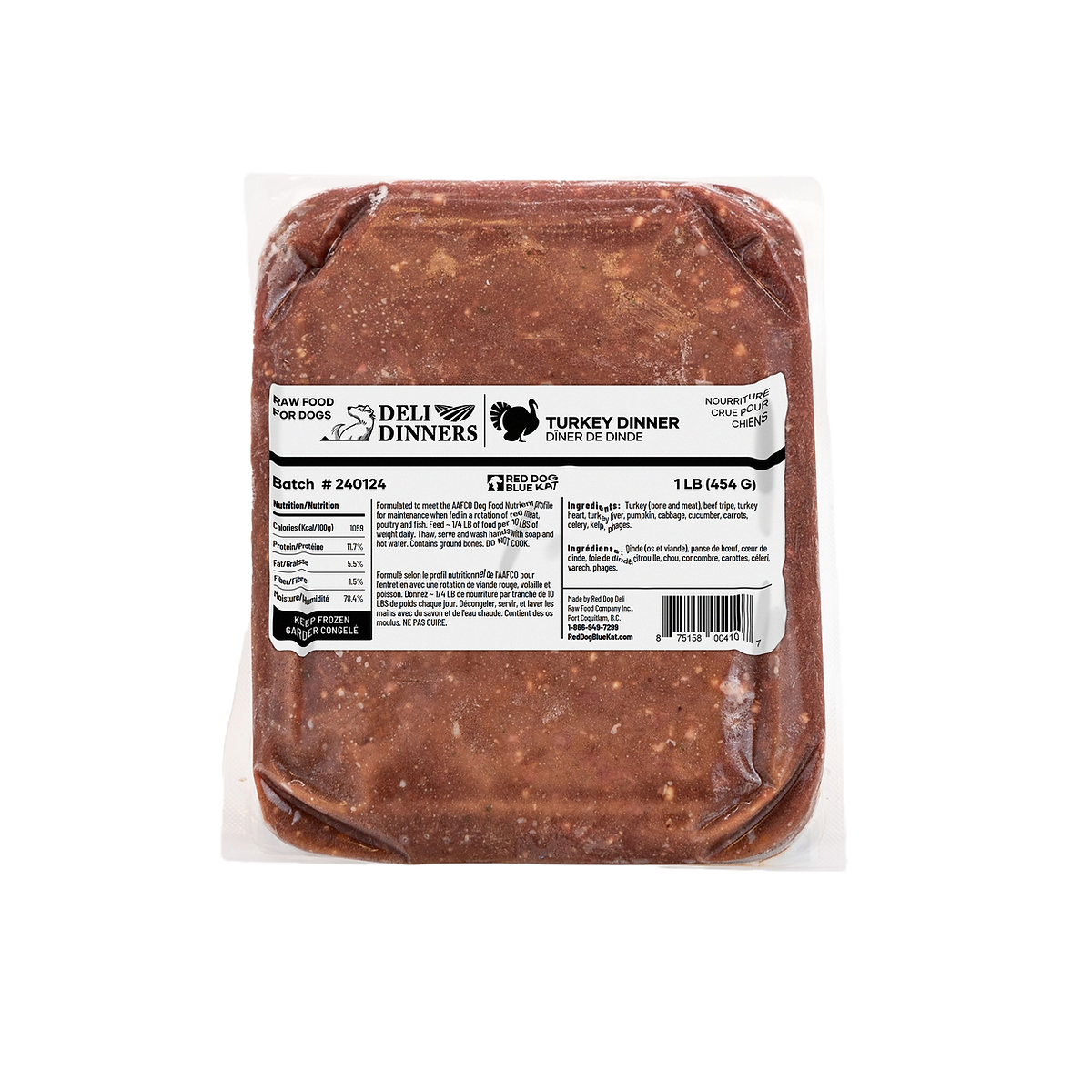 Free-range turkey (meat and bone), beef tripe, turkey heart, turkey liver, pumpkin, cabbage, cucumber, celery, carrots, ginger, kelp, and bacteriophages.